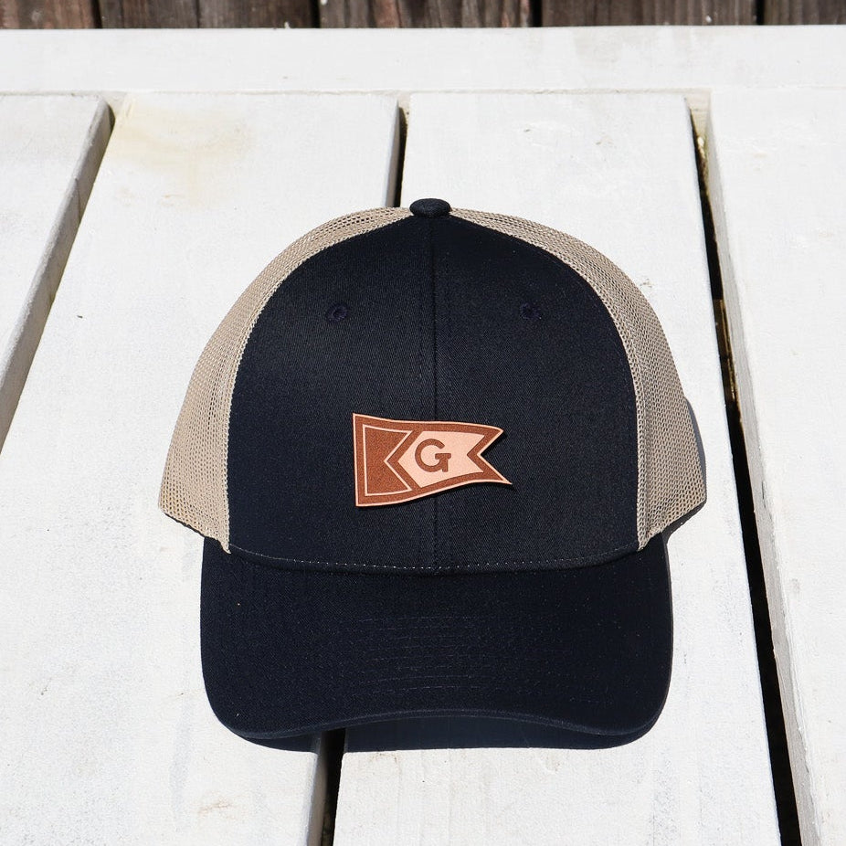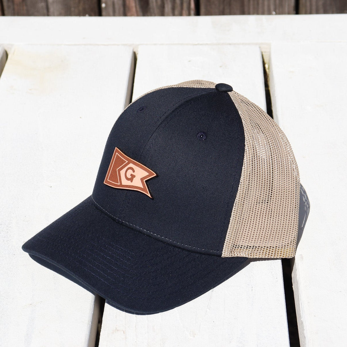 This structured Richardson cap features a genuine leather patch etched with the classic Gage burgee on the front. Designed with a cotton twill front, breathable mesh back, and adjustable snapback strap, it delivers comfortable, all-day wear. Available in Navy, Navy/Khaki, and Red White Navy, this hat adds timeless lake-town character to any outfit.