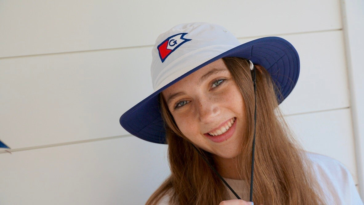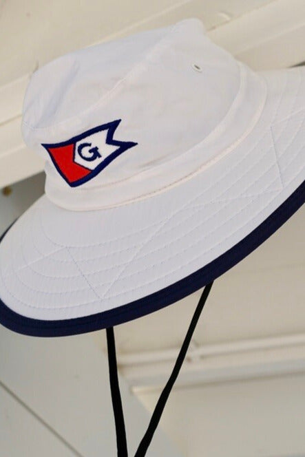 This hat is made to fit in your suitcase or Lake Day tote, then easily pops back into its original shape for sun protection. Perfect for the beach, the boat or just a stroll around the lake, featuring the famous Gage Marine Burgee!