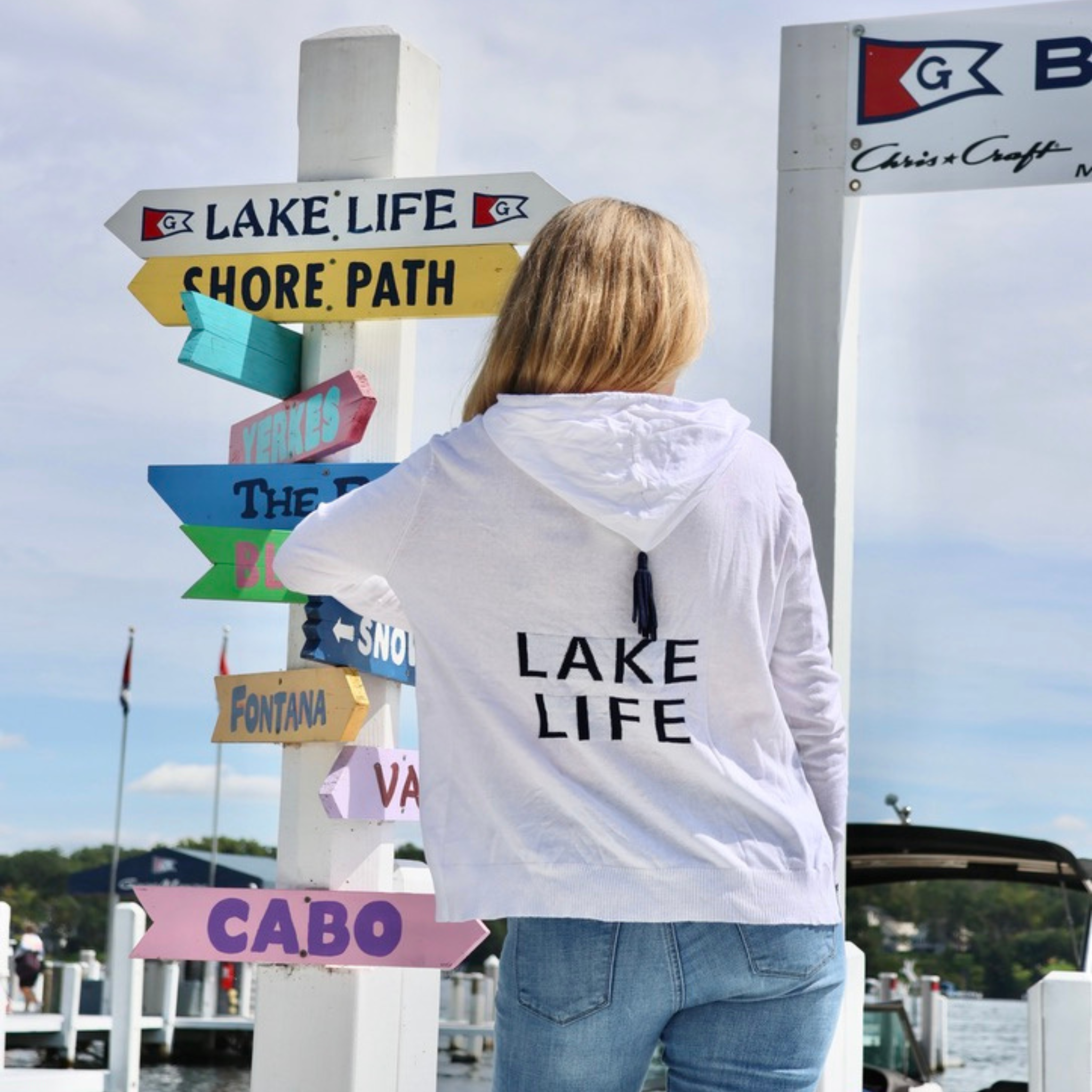 This lightweight Lake Life Hoodie is perfect for throwing on after a day of boating or an evening out. With its cotton fabric and tasseled drawstrings, it will be a staple for your wardrobe!